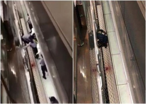 Khoảng 30 giây sau, một người đàn ông cũng ngã xuống. Anh ta đập phải tay vịn thang cuốn trước khi rơi xuống sàn nhà".