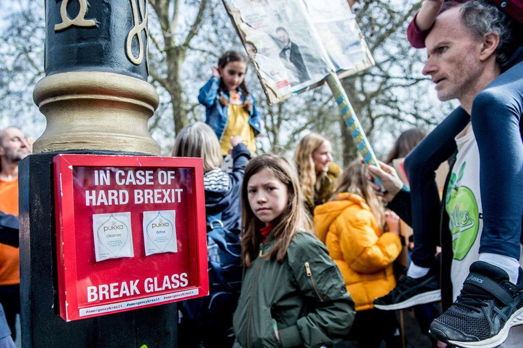 Những người biểu tình đi qua một hộp khẩn cấp giả có chứa túi trà và dòng chữ "Trong trường hợp Brexit cứng, hãy đập vỡ kính". Ảnh: Getty.