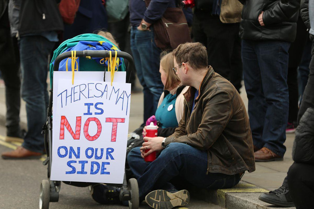 Những người biểu tình ngồi cạnh một chiếc xe đẩy có tấm biển "Theresa May không đứng về phía chúng ta". Các chính trị gia cao cấp từ tất cả đảng lớn đã tham gia tuần hành, bao gồm phó chủ tịch đảng Lao động Tom Watson, cựu phó thủ tướng Tory Lord Heseltine và thị trưởng London Sadiq Khan. Ảnh: Getty.