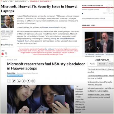 Trang web công nghệ Hoa Kỳ ‘Lightreading’ đưa tin hôm 29/3 rằng, các nhà nghiên cứu Microsoft tại Mỹ vào tháng 1/2019 phát hiện, các máy tính xách tay ‘Matebook’ của Huawei có trang bị ‘cửa hậu’.