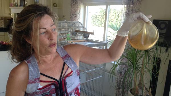 Bà Marga van Amersfoort, chủ tịch hiệp hội các nạn nhân ghép độn silicone giữ lại túi silicone đã dùng để làm bằng chứng buộc tội tại tòa án.Rfi/Antoine Mouteau