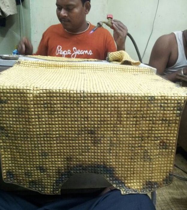 Chiếc mũ vàng có giá 1,8 tỷ đồng của Phúc XO (trên) và áo vàng trị giá khoảng 5,8 tỉ đồng lúc đang "dệt" (dưới)