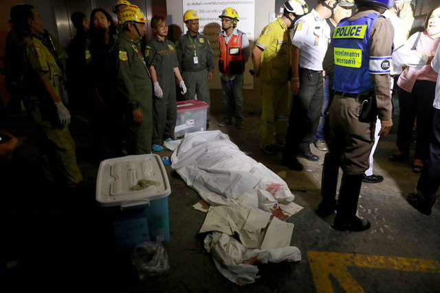 Nhân viên cứu hộ đứng xung quanh thi thể một nạn nhân. Thống đốc Bangkok Aswin Kwanmuang nói rằng ba người thiệt mạng, 7 người bị thương. Truyền thông địa phương đưa tin các nạn nhân thiệt mạng do nhảy từ tầng cao xuống.