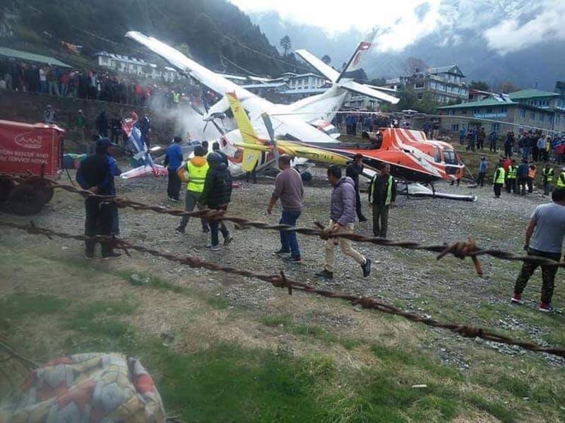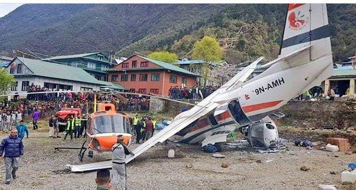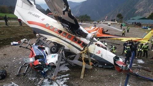 "Chiếc máy bay trượt về phía bãi đỗ trực thăng trong lúc hạ cánh và va chạm với 2 chiếc đang đỗ trên mặt đất", Ema Nath Adhikari, quan chức sân bay Lukla, trả lời AFP. Sân bay Lukla là một trong những sân bay khó cất cánh và hạ cánh nhất trên thế giới do địa hình bị bao quanh bởi đồi núi. Ảnh: AFP.