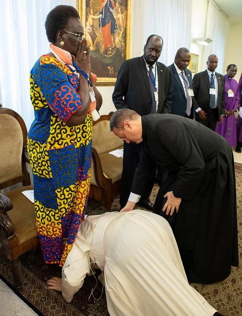 Nhiều người sửng sốt khi bất ngờ Giáo hoàng Francis quỳ gối và hôn chân của lãnh đạo các phe phái đối lập ở Nam Sudan, khiến động thái bất ngờ này nhằm khuyến khích các lãnh đạo đối lập của Nam Sudan vực dậy tiến trình hòa bình đang đổ vỡ để tránh cho quốc gia châu Phi này quay trở lại nội chiến đẫm máu.