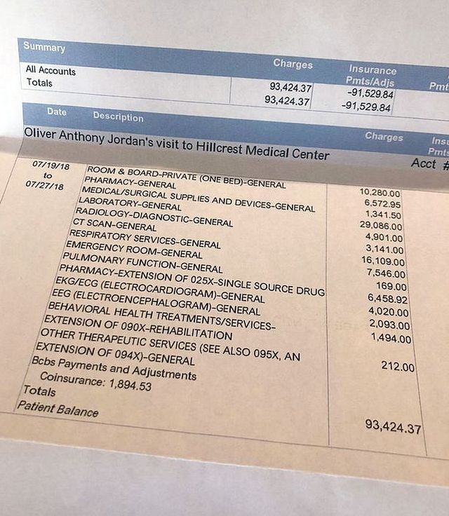 Không biết nên vui hay nên buồn khi sau 1 tuần nằm viện, Jordan đã phải đối mặt với hóa đơn gồm 17 mục chi phí khác nhau, bao gồm 29.000 USD (hơn 675 triệu đồng) tiền nằm phòng chăm sóc đặc biệt, 10.280 USD (gần 240 triệu đồng) chi phí giường nằm, 16.109 USD (gần 375 triệu đồng) phí thở bình oxy,…