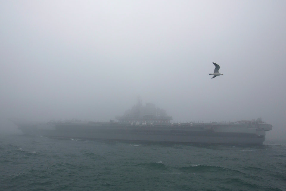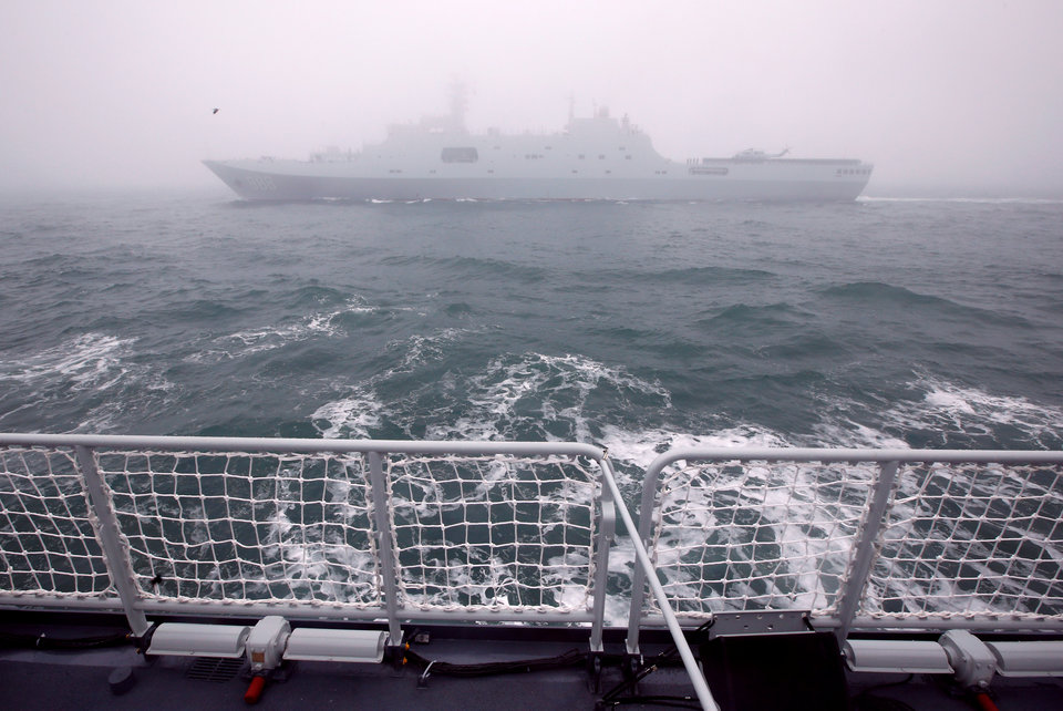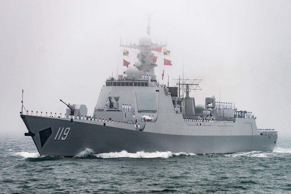 Dưới làn sương mù, gió mạnh cùng mưa nhỏ, các tàu ngầm, tàu chiến Hải quân Trung Quốc lướt trên biển, trình diện trước các lãnh đạo nước nhà và phái đoàn hải quân tới từ hơn 60 quốc gia.