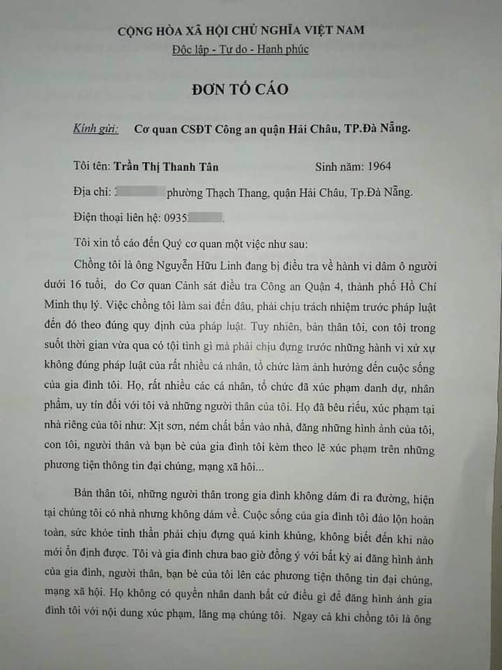 Vợ của tên dâm ô Nguyễn Hữu Linh sàm sỡ bé gái trong thang máy chung cư. Sau khi người dân đến nhà check in quá nhiều. Vợ Linh "nựng" cuối cùng cũng viết thư gửi cộng đồng mạng và cơ quan công an, hai đơn thư lộ rõ bản chất dối trá của bà ta.