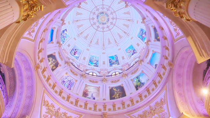 Ở trung tâm tòa nhà, các chi tiết chạm nổi trên trần đều được mạ vàng. Những bức họa về chúa và các vị thần được lồng ghép một cách khéo léo, mang tới cảm giác bình an cho gia chủ. Công trình này có nhiều phần được ốp đá Tây Ban Nha. Ở đây có một phòng nghe nhạc rộng khoảng 700 m2 với đủ bộ sân khấu, chứa được hơn 300 khán giả.