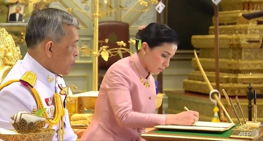 Vua Vajiralongkorn và hoàng hậu Suthida ký vào sổ đăng ký kết hôn hôm 1/5. Ảnh: Channel News Asia.