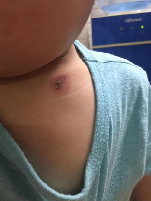 Trong số những hình ảnh của Petter được chị Bích Hằng đăng tải, có một ảnh chụp cận cảnh vết thương trên cổ cậu bé, được cho là vết đầu điếu thuốc lá dí vào khiến nhiều người không khỏi xót xa.