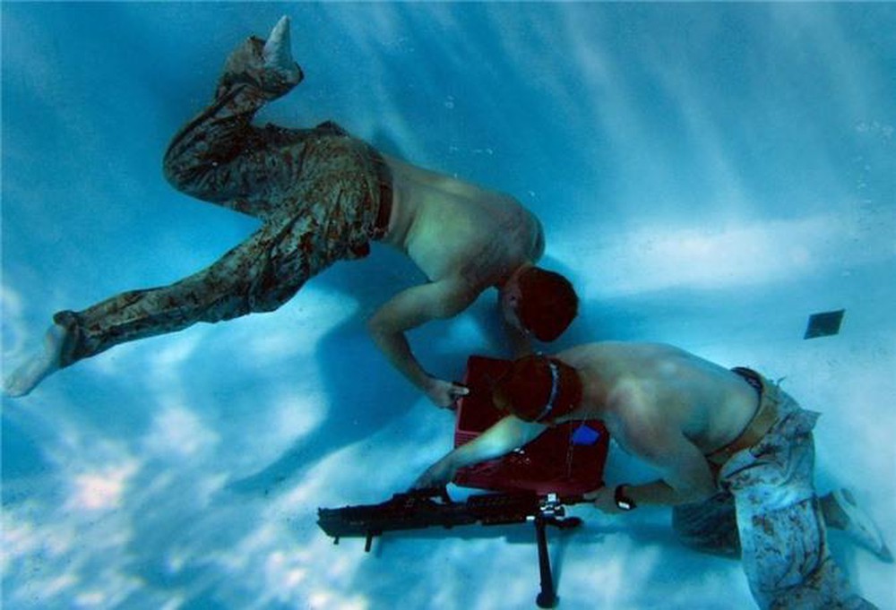Mỗi năm, lính hải quân phải trải qua các kỳ kiểm tra về kỹ năng. H́nh ảnh trên là bài kiểm tra lắp đặt và sử dụng súng M240G ở độ sâu 15 feet (4,5 mét) dưới biển. Bài kiểm tra này diễn ra tại căn cứ Hải quân Pendleton, California.