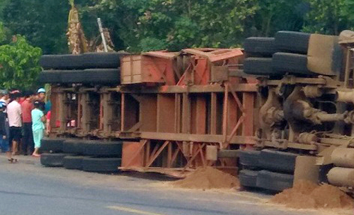 Khi xe container đang lưu thông bất ngờ bị lật. Khi cẩu thùng xe bị lật trên Quốc lộ 14 ở Bình Phước, tài xế container mới phát hiện hai anh em đi xe máy bị đè chết.