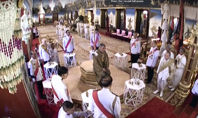 Sau lễ Quán Đỉnh, Vua Vajiralongkorn ngồi lên ngai Phatharabit, chiếc ghế mạ vàng nằm giữa hai bàn cao.. (Ảnh: Thai PBS).