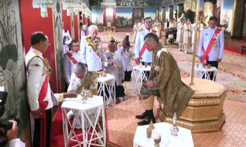 Sau nghi thức tắm tẩy trần ở Cung Chakrabat Biman, Vua Vajiralongkorn thực hiện nghi thức Quán Đỉnh, tức rót nước thiêng lên đầu.