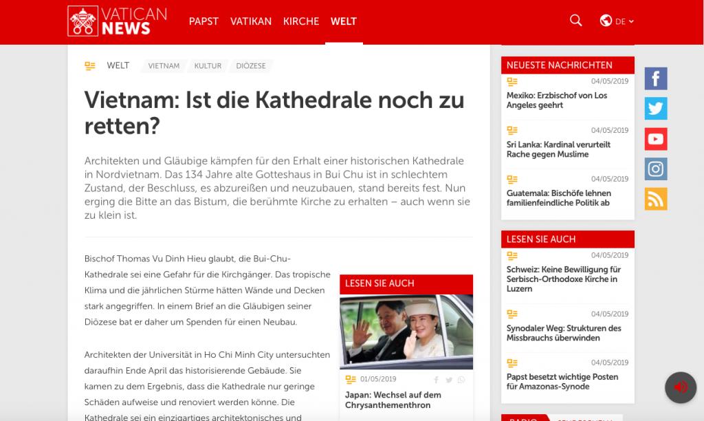 Vatican đưa tin về nhà thờ Bùi Chu. Nhà thờ được xây dựng cách đây 134 năm sẽ bị phá đi xây mới bởi vì đang bị xuống cấp trầm trọng. Trên trang web của Vatican (Vatican News) ngày 3/5 đã đăng tải một bản tin tiếng Đức về nhà thờ Bùi Chu với tiêu đề: "Việt Nam: Liệu còn cứu được nhà thờ?".