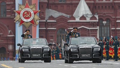 Buổi lễ bă't đầu bằng việc Bộ trưởng Quốc phòng Nga Sergei Shoigu (phải) và Tư lệnh lục quân Nga Oleg Salyukov kiểm tra các khối duyệt binh trên chiếc Aurus Senat do nước này tự chế tạo. Đây là lần đầu tiên xe Aurus Senat được sử dụng trong lễ Duyệt binh Chiến thắng của Nga.