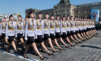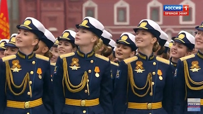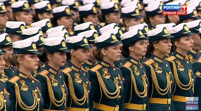 Đội hình nữ quân nhân Nga đa'nh mặt nghiêng và đi nghiêm bước qua lễ đài, họ nổi bật hơn với chiếc mũ nồi trắng đội trên đầu. Theo Sputnik, khoảng 10% binh sĩ quân đội Nga là nữ giới.
