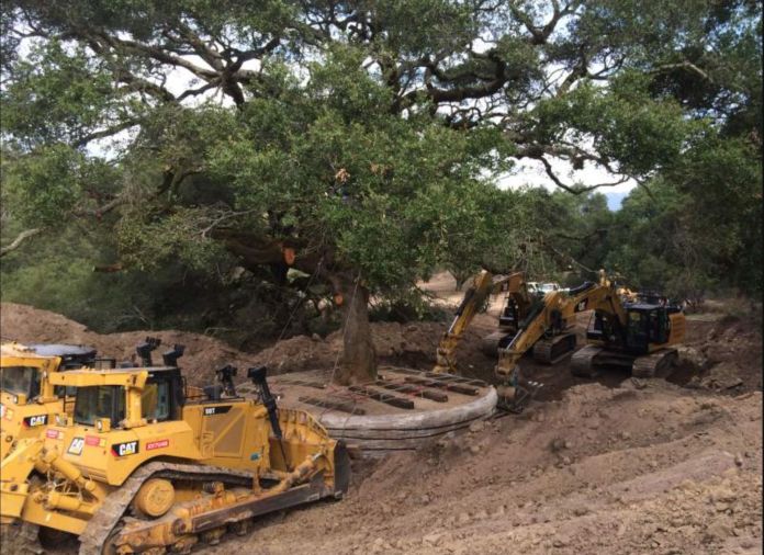 Các xe cơ giới và cây sồi được bọc để chuẩn bị kéo đi. (Hình: Sonoma Land Trust)