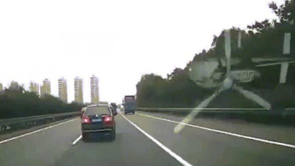 Tấm kim loại bay với tốc độ cao hướng về phía chiếc ô tô màu trắng đang di chuyển phía sau. Tài xế của chiếc xe không thể phanh hay chuyển hướng trước khi tấm thép xuyên qua kính chắn gió.