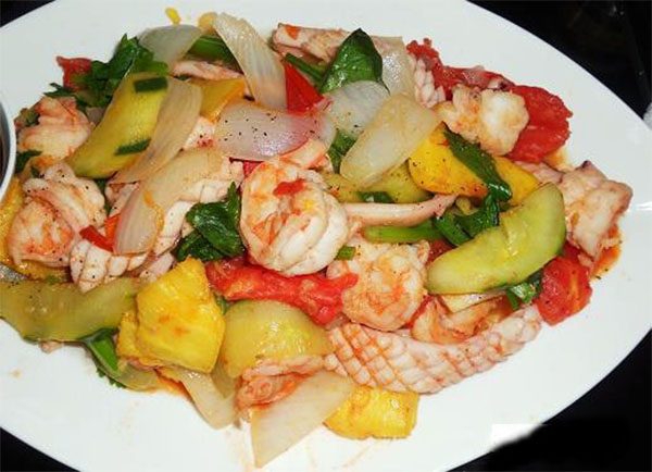 Nguyên liệu: 2 con mực ống + 1/2 quả dứa + 1 qả cà chua + cần tây + tỏi tây + hành khô + tỏi.