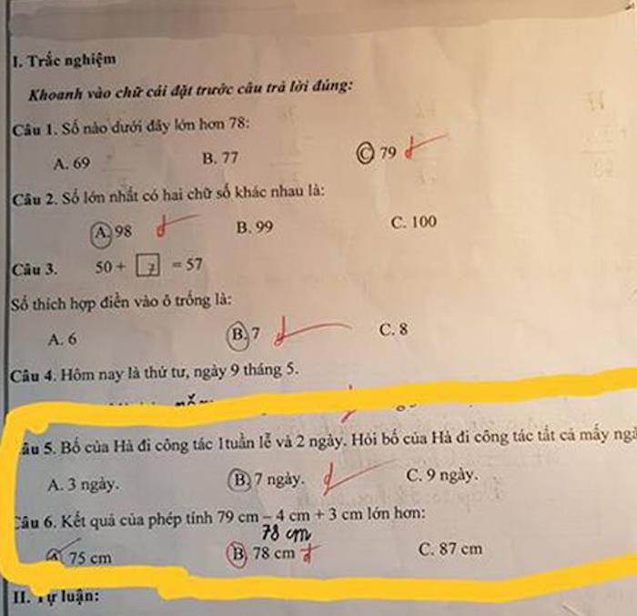 Còn ở câu hỏi số 6, nếu người làm không đọc kỹ đề thì chắc chắn sẽ làm sai. Trong trường hợp này, học sinh thì đọc kỹ đề, nhưng giáo viên thì lại không. Câu hỏi đưa ra rất rõ ràng: "Kết quả của phép tính 79cm - 4cm + 3cm lớn hơn?" Các đáp án lần lượt được đưa ra là 75cm, 78cm và 87cm. Học sinh chọn đáp án 75cm, nhưng bị cô giáo gạch sai và cô đưa ra đáp lán là 78cm. Kết quả của phép tính trên đúng là 78cm, nhưng rõ ràng đề bài hỏi kết quả của phép tính lớn hơn số nào mà?