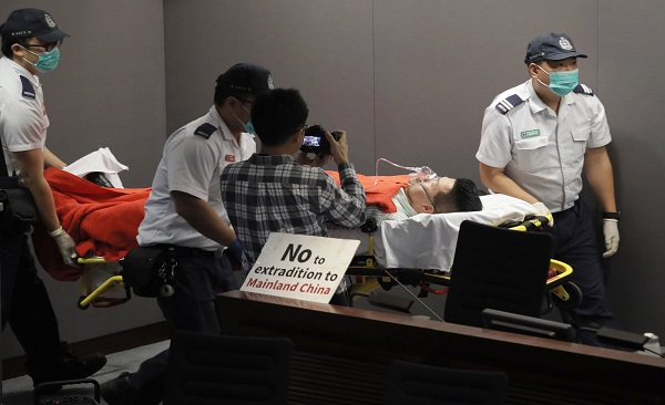 Nhà lập pháp ủng hộ dân chủ Gary Fan Kwok-wai được đưa đi sau khi bị thương trong một vụ đụng độ tại Hội đồng lập pháp ở Hồng Kông ngày 11/5/2019. (Ảnh: AP/Kin Cheung)