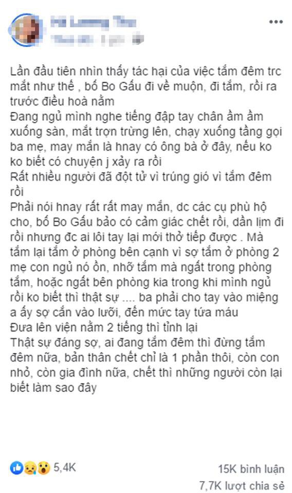Chủ tài khoản cảnh báo thêm, chồng chị đã quen tắm đêm trong một thời gian dài, bỗng nhiên bị bệnh như vậy nên bất cứ ai đừng mạnh miệng tuyên bố điều gì về tính mạng, sức khỏe, đừng cho rằng mình tắm mãi có làm sao đâu…