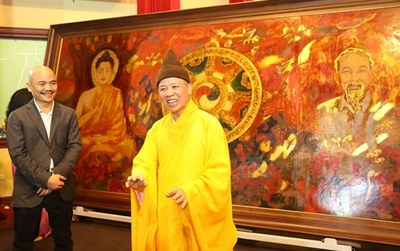 “Toàn bộ bức tranh là trí tuệ, chất liệu tâm huyết của người Việt Nam vẽ Đức Phật và Chủ tịch Hồ Chí Minh. Năm nay ngày sinh của đức Phật và chủ tịch Hồ Chí Minh lại trùng nhau, hiếm có ngày nào như vậy, vì vậy tâm thành của các cư sĩ Phật tử, tri thức và các hoạ sĩ đã vẽ một bức tranh đặc biệt như vậy.”