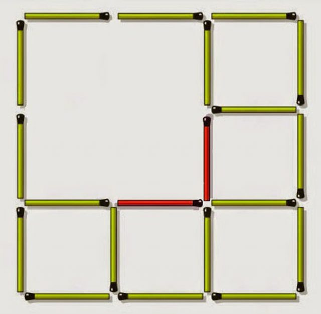 3. Dời hai que diêm phía trong và phía dưới bên hình vuông ở góc trái xuống làm thành 3 hình vuông "Nhỏ" bên phải và 3 hình vuông "Nhỏ" phía dưới. Đáp số sẽ là 6 hình vuông nhỏ và một hình vuông lớn.