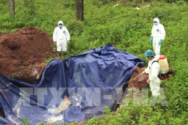 Cán bộ thú y chôn lấp lợn bệnh, phun thuốc khử trùng khu vực dịch.