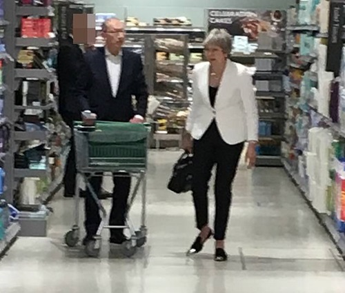 Thủ tướng Anh Theresa May đi siêu thị chiều 24/5, phía sau là ông Philip, chồng của bà. Ảnh: Twitter.