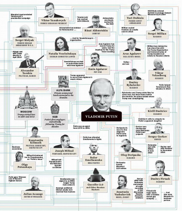Theo một hướng khác, cáo trạng của công tố viên đặc biệt cho biết rằng Manafort đã thảo luận về kế hoạch thân thiện với Nga để giải quyết bạo lực đang diễn ra ở Ukraine ( dỡ bỏ một loạt các biện pháp trừng phạt đối với Nga) với một đối tác kinh doanh có tên Konstantin Kilimnik tại cuộc họp tháng 8 năm 2016 tại New York. Cuộc thảo luận này diễn ra sau khi chiến dịch Trump đã can thiệp vào Hội nghị Quốc gia của Đảng Cộng Hòa để loại bỏ một điều khoản thù địch liên quan đến Nga (xâm lược Crimea) và sau khi Trump đề nghị công khai rằng ông ủng hộ các thái độ của Nga về NATO và Crimea. Một hồ sơ tư vấn đặc biệt đã nói rằng Kilimnik có mối quan hệ tích cực với Nga và với tình báo Nga vào thời điểm đó nhưng không có cơ sở vững chắc. Hồ sơ tòa án cho thấy thêm rằng Manafort đã chia sẻ dữ liệu bỏ phiếu của chiến dịch với Kilimnik tại cuộc họp tháng 8 năm 2016. (Manafort, vào thời điểm đó, vẫn là chủ tịch chiến dịch.)