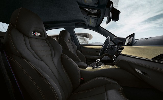 Trong khi đó, cabin Edition 35 Years sử dụng cặp ghế thể thao M Sport bọc da đen cao cấp cùng chỉ khâu màu be bên cạnh điểm nhấn là cụm điều khiển trung tâm và ốp cửa mạ vàng. Táp lô vẫn sử dụng cấu hình màn đôi cỡ lớn với bảng đồng hồ kỹ thuật số 12,3 inch và màn cảm ứng 10,3 inch giống X5 hay 8-Series. Huy hiệu M5 Edition 35 Years được khắc lên thềm cửa và cụm điều khiển.