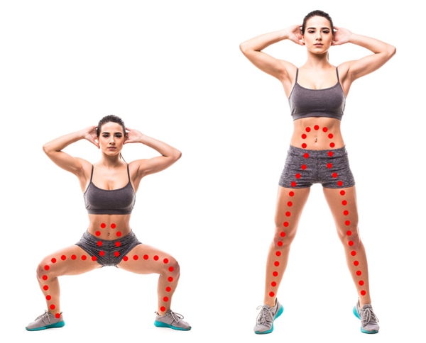 Đứng thẳng, hai chân rộng bằng hai vai, bàn chân mở rộng, hai tay để sau gáy. Hạ thấp trọng tâm sao cho đầu gối vuông góc, lưng thẳng, mông đưa về phía sau. Giữ trong 3 giây rồi đứng thẳng dậy, kiễng chân. Lặp lại động tác 20 lần.