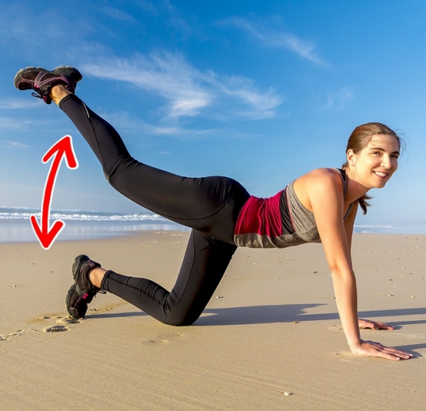 Quỳ gối trên thảm, đầu gối vuông góc. Rút một chân lên cao sát ngực, đá thẳng về phía sau rồi quay tròn một vòng, rút gối lại, về tư thế ban đầu. Lặp lại động tác 20 lần mỗi bên.