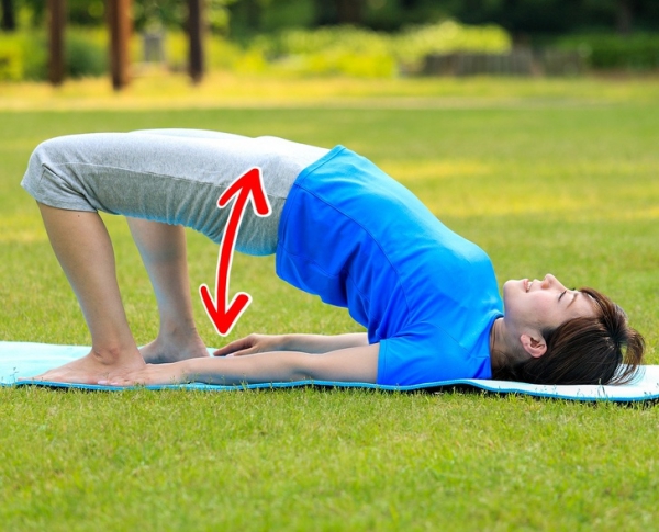 Nằm ngửa trên thảm, hai gối gập, hai tay duỗi thẳng. Dùng cơ bụng và mông nâng thân người lên cao, giữ trong 3 giây rồi trở về tư thế ban đầu. Lặp lại động tác 20 lần.