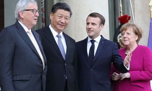 Từ trái sang: Chủ tịch EC Jean-Claude Juncker, Chủ tịch Trung Quốc Tập Cận Bình, Tổng thống Pháp Emmanuel Macron và Thủ tướng Đức Angela tại cuộc gặp ở Paris, Pháp, hồi tháng 3. Ảnh: AFP.