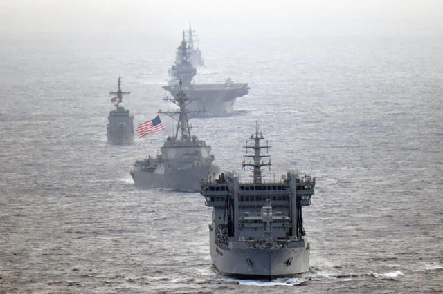Tàu hải quân của 4 nước Mỹ, Ấn Độ, Nhật Bản và Philippines đi qua Biển Đông trong cuộc tập trận chung đầu tháng 5. (Ảnh: Japan Times)