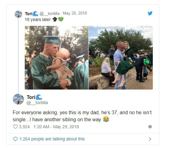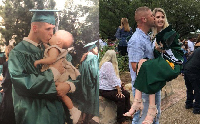 Ảnh trái là ông Tori ôm con gái bé bỏng trên tay và hôn đứa trẻ ngay ngày tốt nghiệp phổ thông. Và 18 năm sau, Tori vẫn nằm gọn trong vòng tay bố, tốt nghiệp tại chính ngôi trường trước đây ông từng theo học.