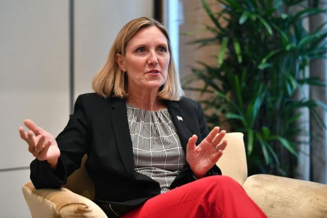 Bà Andrea L. Thompson, Thứ trưởng Ngoại giao Mỹ, trao đổi với báo chí bên lề Đối thoại Shangri-La tại Singapore ngày 2/6 (Ảnh: Straitstimes)