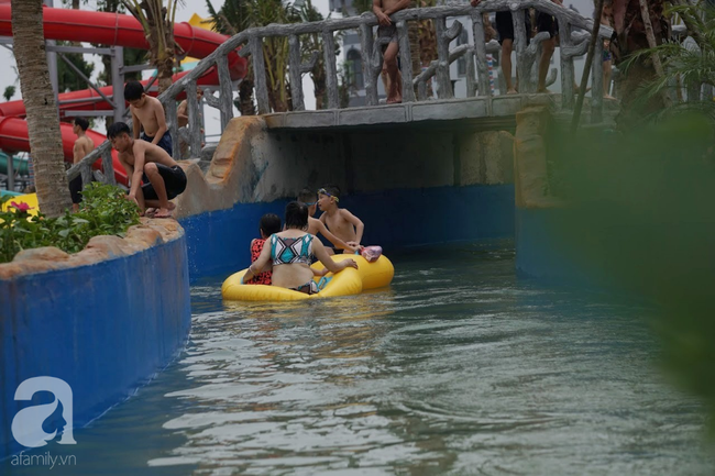 Theo ghi nhận của PV thì khu vực bể bơi tạo sóng không có sóng, có thể do quá tải nên thiết bị, hệ thống không hoạt động được liên tục, đến hôm nay chỉ giống như một bể bơi bình thường, nước xanh nhưng không hấp dẫn lắm. Số lượng phao bơi cũng rất ít, nên nhiều phụ huynh ngại ngần không dám cho con nhỏ xuống nước đùa nghịch.
