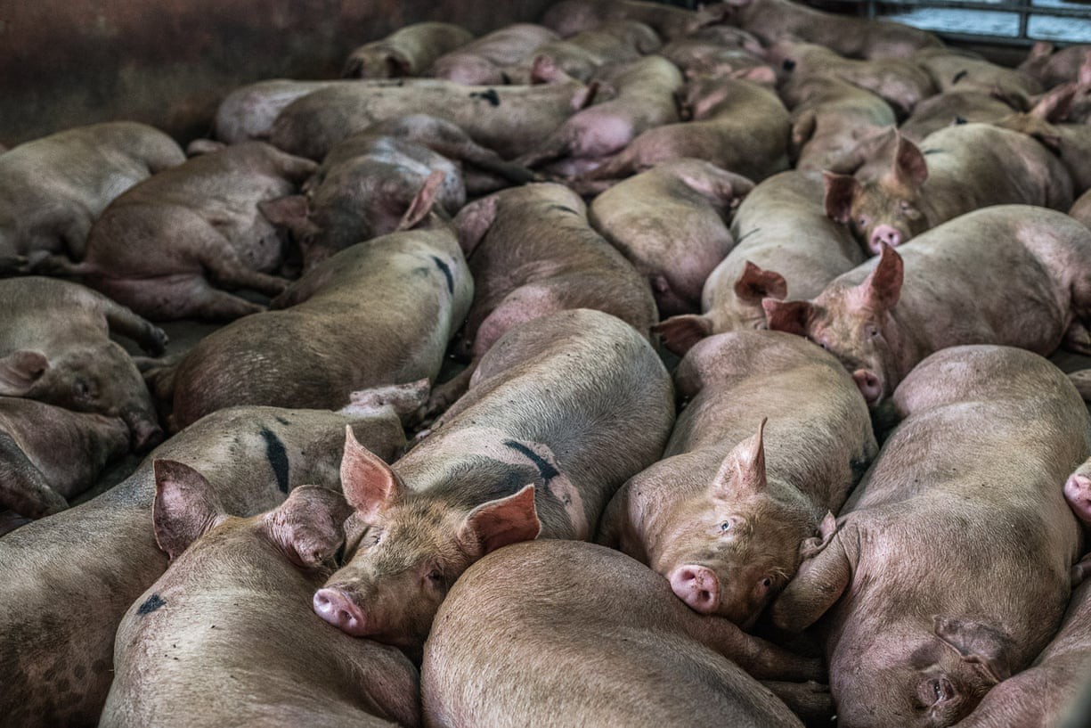 Những con lợn bị nhồi nhét lên những chiếc xe tải chật hẹp để đưa đến các ḷ giết mổ.