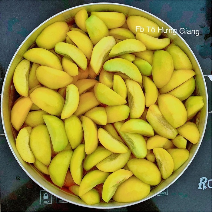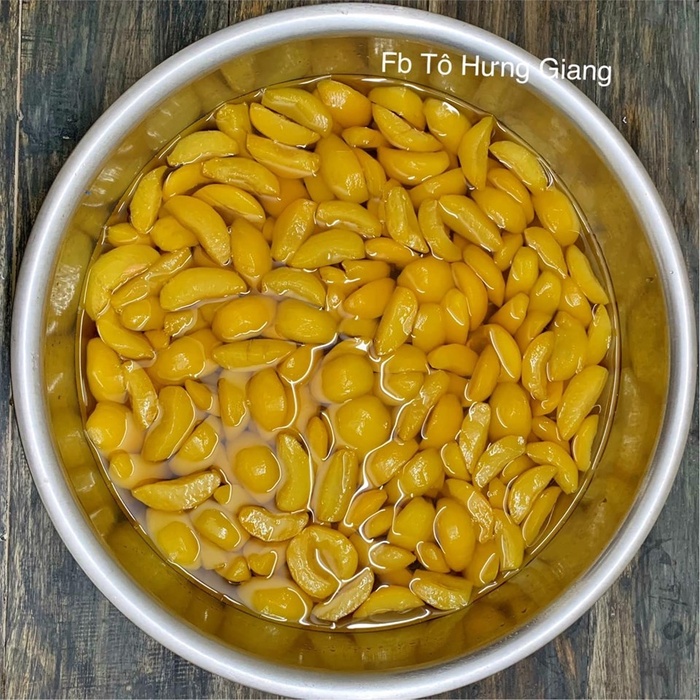 Đào tách xong thì thả ngay vào chậu nước muối loãng pha chút chanh tươi để miếng đào không bị thâm, lưu ý là tách đào cả vỏ sẽ dễ hơn và không bị nát, sau đó mới gọt vỏ. Còn nếu gọt vỏ trước khi tách sẽ khó vì quả đào trơn, tách xong miếng đào bị nát, nhũn chảy nước.