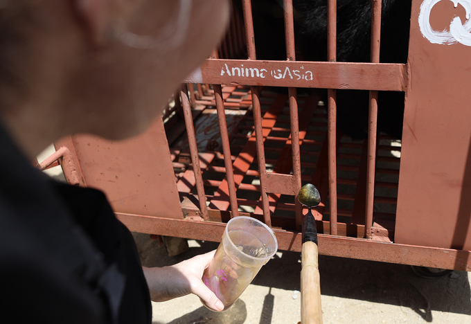 Chuồng nuôi nhốt và chuồng đặc chủng được đặt cạnh nhau, cố định bằng các sợi dây cáp để tránh xê dịch trong quá trình di chuyển con vật. Lúc này, gấu trong tình trạng hoảng loạn và chạy khắp chuồng. Nhân viên cứu hộ dùng mật ong để dụ gấu di chuyển từ chuồng nuôi nhốt sang chuồng đặc chủng.