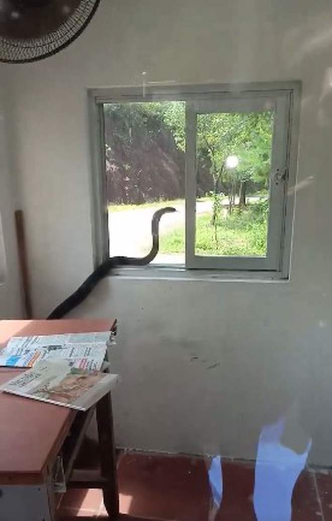 Trong đoạn clip, con rắn hổ mang trườn bò khắp cabin phòng bảo vệ, trên bàn, tường và cửa sổ. Con rắn có bộ da đen bóng, dài khoảng hơn 1 mét, mang phình rộng và liên tục thè lưỡi.