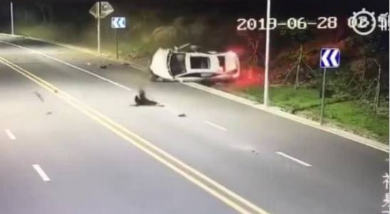 Khoảng 3h ngày 28/6 tại con đường ở huyện Thạch Sư (thành phố Tuyền Châu, tỉnh Phúc Kiến), chiếc ôtô màu trắng phi với tốc độ cao lao thẳng khỏi đường ở khúc cua gấp. Sau khi đ.âm đổ một biển báo giao thông, húc vào sườn đất cao, xe lộn khoảng 6 vòng và tiếp đất. Một người trong xe bay lên không trung và rơi xuống đường.