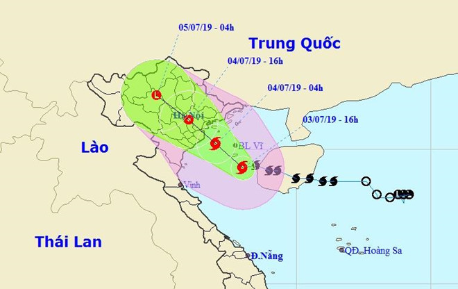 Rạng sáng ngày 4/7, bão đi vào khu vực đất liền các tỉnh từ Quảng Ninh đến Thanh Hóa với vận tốc 15 km/h, sức gió mạnh cấp 8, giật cấp 10. Ngay sau đó, bão sẽ suy yếu dần thành áp thấp nhiệt đới.
