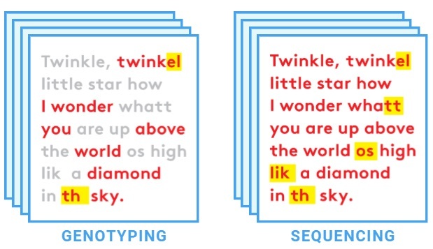 Mô phỏng xét nghiệm gen ngẫu nhiên (genotyping) và giải trình tự gen toàn bộ (sequencing). Đồ họa: Forbes.