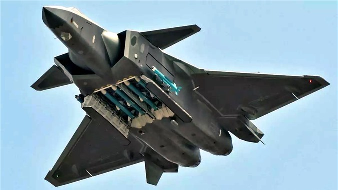 Tiêm kích tàng h́nh J-20 tối tân của Trung Quốc mang theo các tên lửa, kể cả PL-15, ở dưới bụng. Ảnh: Weibo